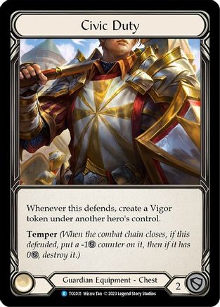 Whenever this defends, create a Vigor token under another hero's control. Temper (When the combat chain closes, if this defended, put a -1{d} counter on it, then if it has 0{d}, destroy it.)