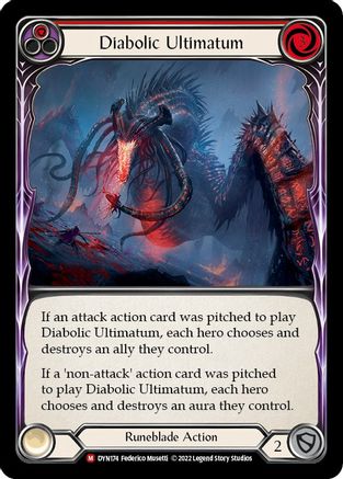 If an attack action card was pitched to play Diabolic Ultimatum, each hero chooses and destroys an ally they control. If a 'non-attack' action card was pitched to play Diabolic Ultimatum, each hero chooses and destroys an aura they control.