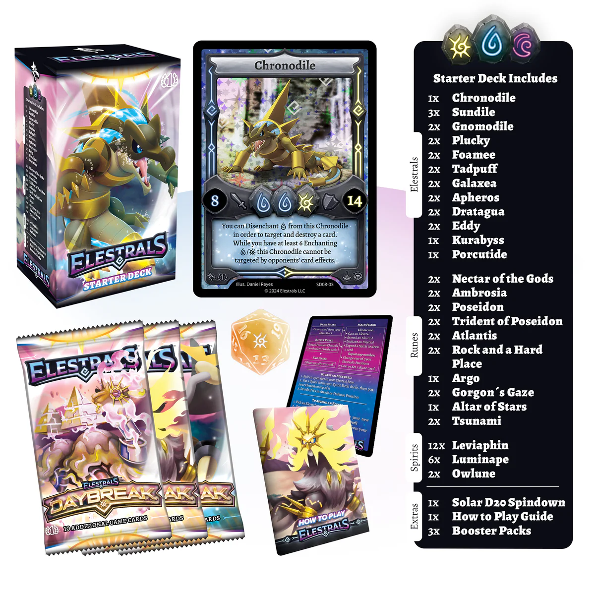 The Daybreak Chronodile Starter Deck is perfect for Solar or Water Casters, featuring the all-new radiant Solar Elestral, Chronodile! With only 99 Chronodile Starter Decks containing a serialized Stellar Rare Sundile, and a chance for an ultra-rare, limited-edition Reverse Stellar Rock and a Hard Place, this deck is as dazzling as it is powerful.