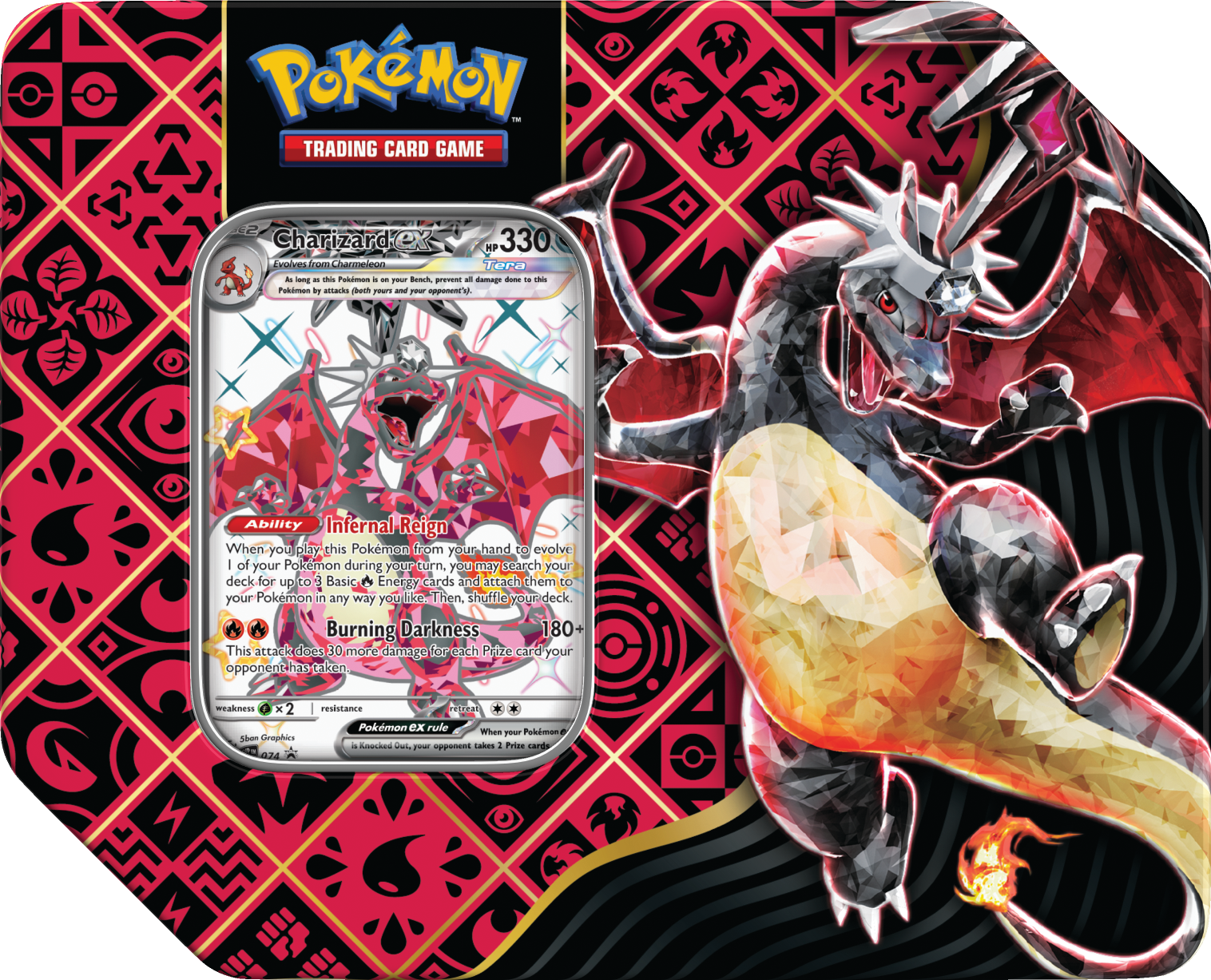 Behold the breathtaking power of Shiny Pokémon ex who transcend the boundaries of time and type! With this tin, choose the quaking force of Great Tusk ex and an Ancient Pokémon, the iron-clad determination of Iron Treads ex as a Future Pokémon, or the burning spirit of Charizard ex as a Darkness-type Terra Pokémon. Then, discover even more awesome cards in Scarlet & Violet - Paldean Fates booster packs!